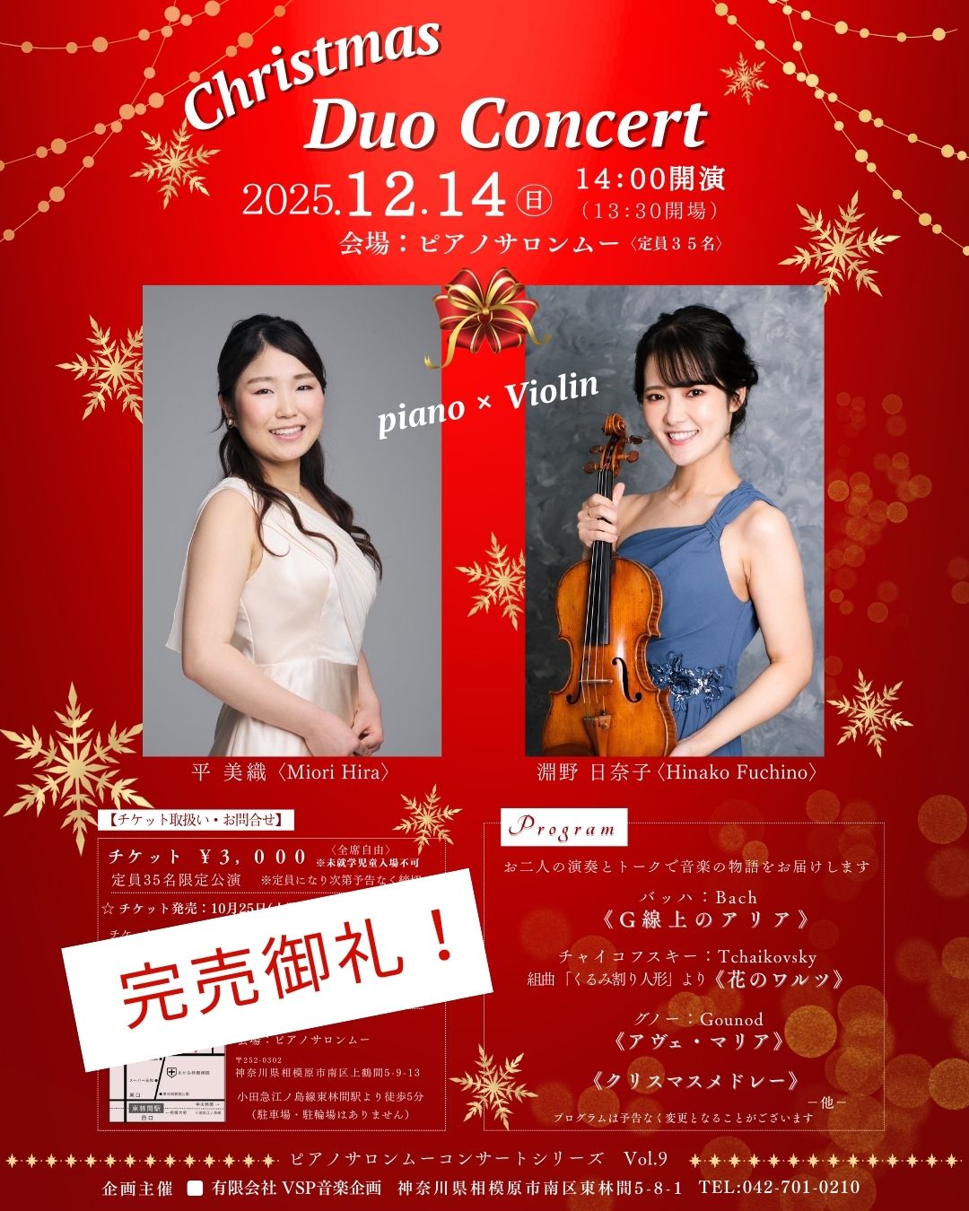 クリスマスコンサートのお知らせ Posted on 2025年12月10日2025年12月10日 ~1階ピアノサロンよりコンサートのお知らせ~ 12月14日(日曜) クリスマスデュオコンサート 平美織&淵野日奈子 若手お二人によるクリスマスデュオコンサートをお届けいたします
